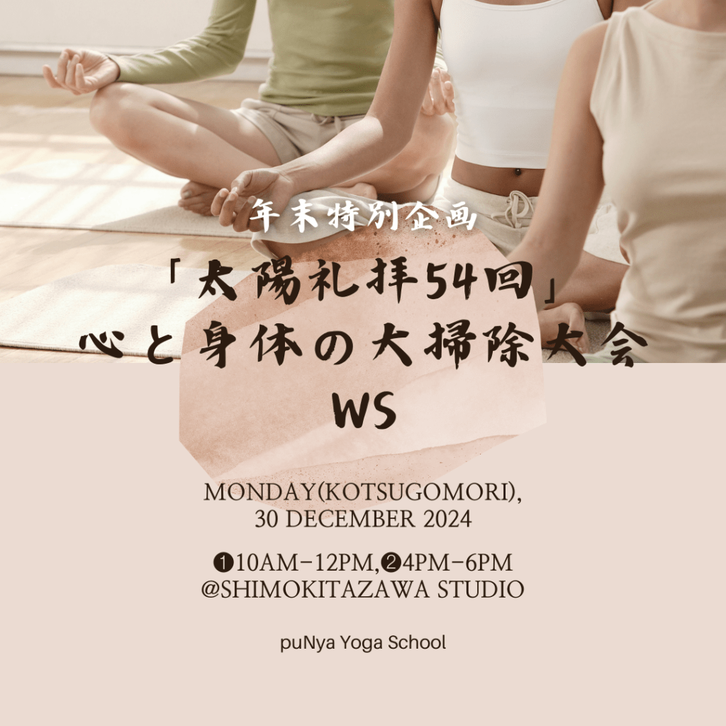 太陽礼拝を1年の終わりに108回の半分である54回行うことで、身体をコントロールすることから深い集中(瞑想)状態に入り、かつ108回の1/2の回数で無理なく、煩悩の浄化を目指しましょう。